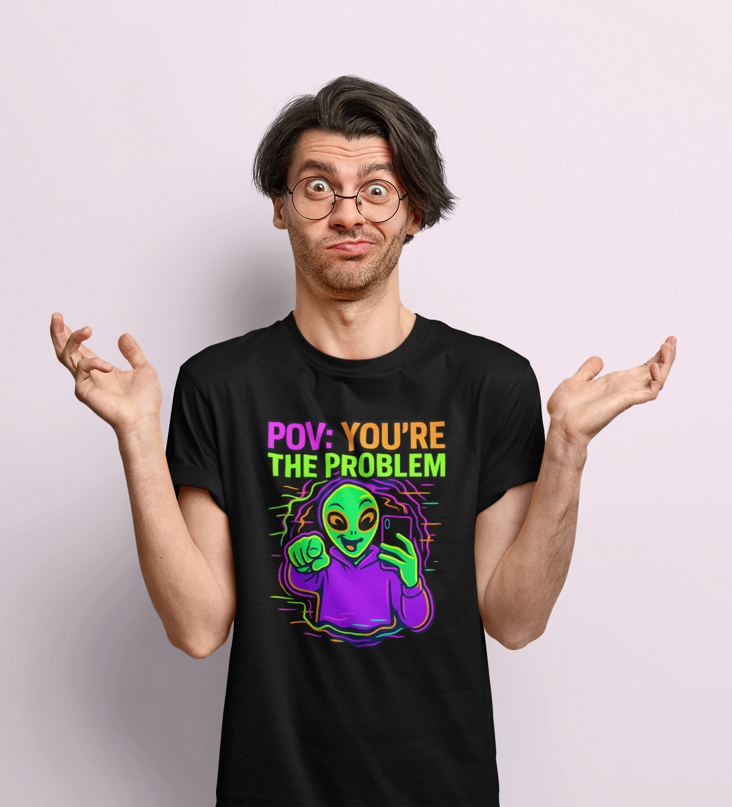 Elevate your streetwear (and your side-eye game) with the “POV: YOU’RE THE PROBLEM” Alien Graphic Tee. Featuring a neon-glow alien pointing right at you, glitch-art accents, and a bold pink-orange slogan, this shirt is guaranteed to turn heads—and maybe start a few conversations.