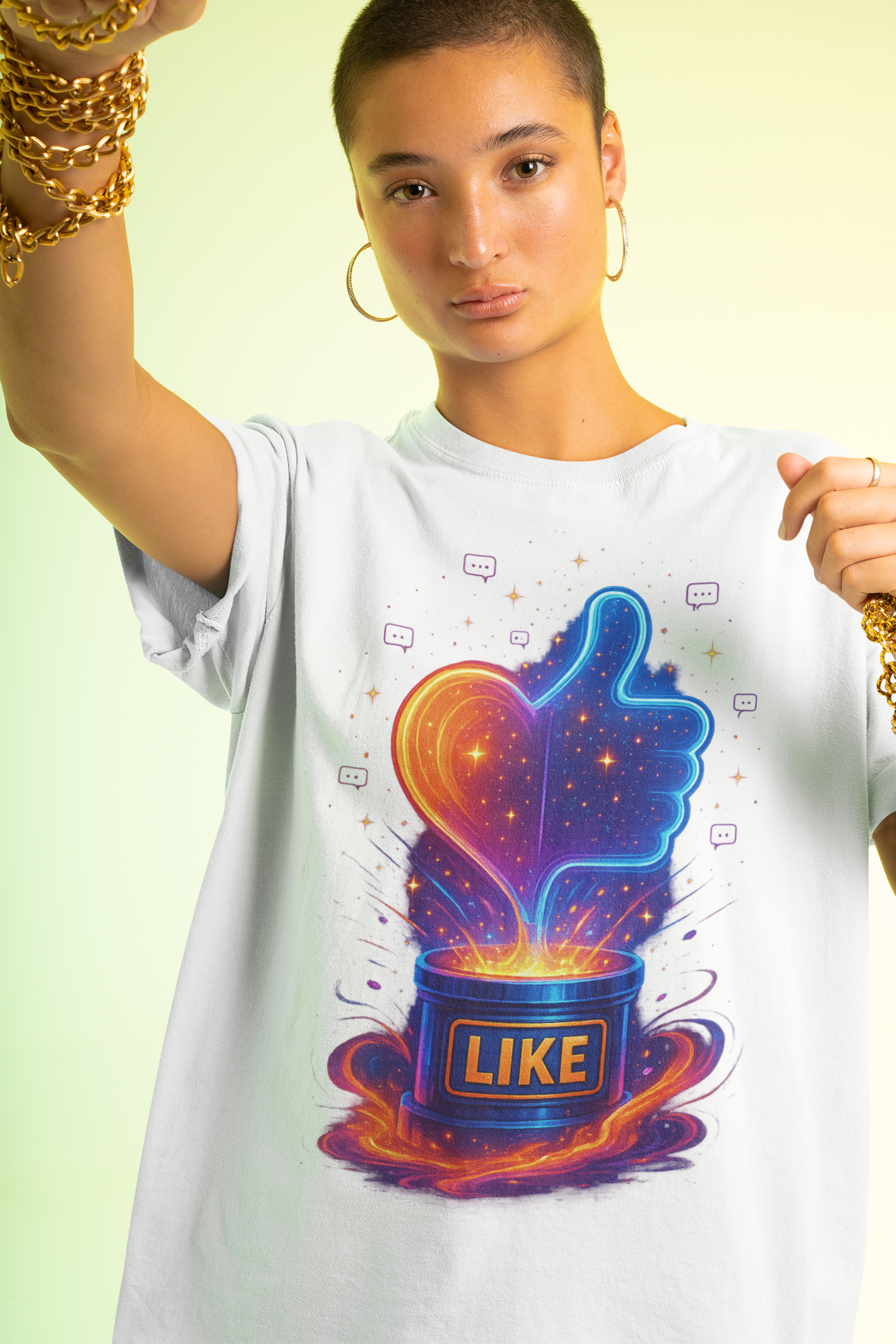 Light up your wardrobe with the Cosmic Like Button Tee, a must-have for social-media lovers, digital dreamers, and anyone who’s all about spreading good vibes. This eye-catching design features a neon-burst “Like” icon emerging from a glowing canister, surrounded by stardust and floating chat bubbles—perfectly capturing that out-of-this-world energy. Printed on soft, premium-weight cotton, this tee offers a classic fit that looks great on everyone.