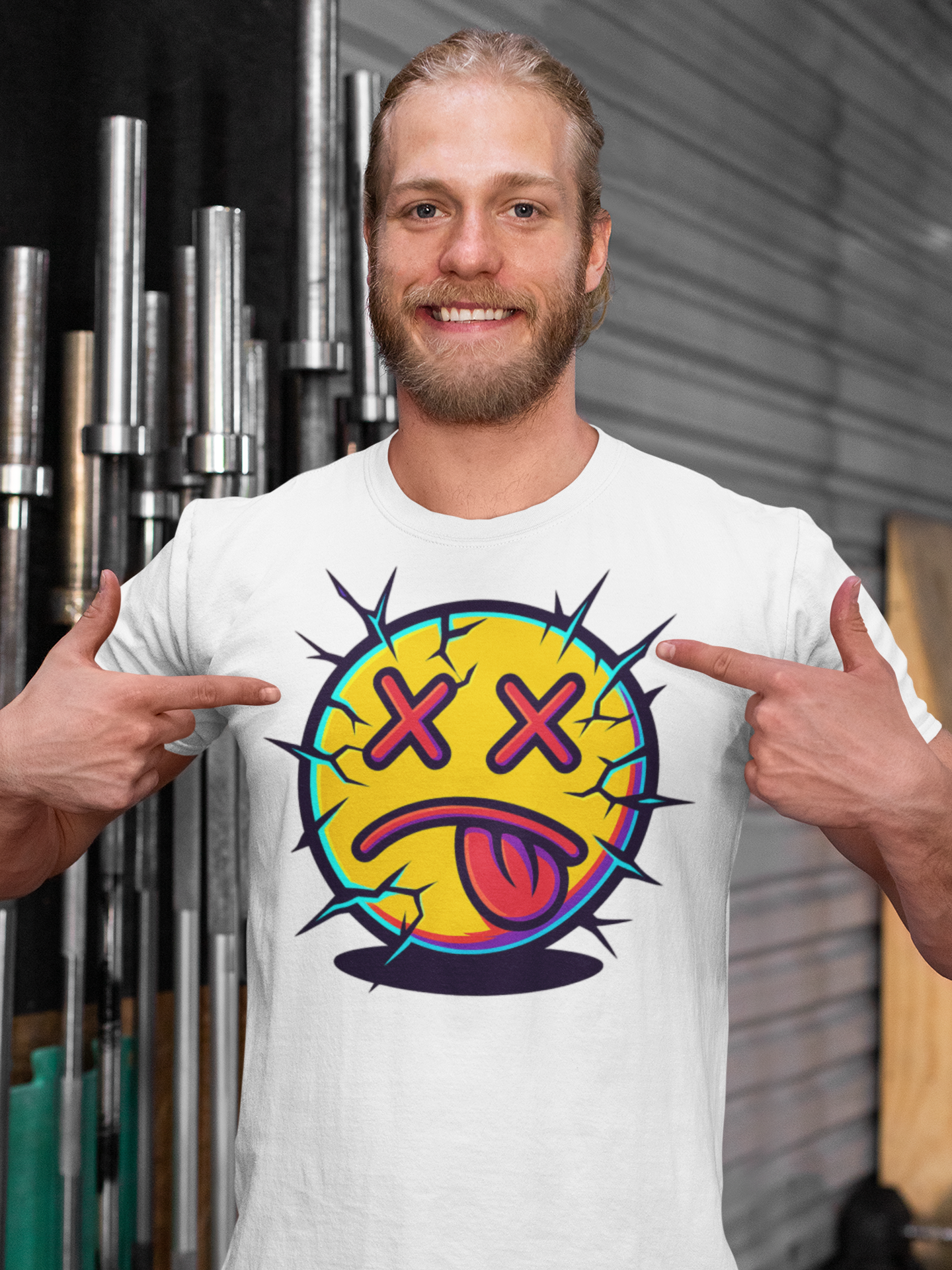 Turn heads in this bold black tee featuring a neon-outlined, cracked yellow emoji with X-eyes and its tongue playfully hanging out. Printed with high-definition DTF for vibrant, long-lasting color.
