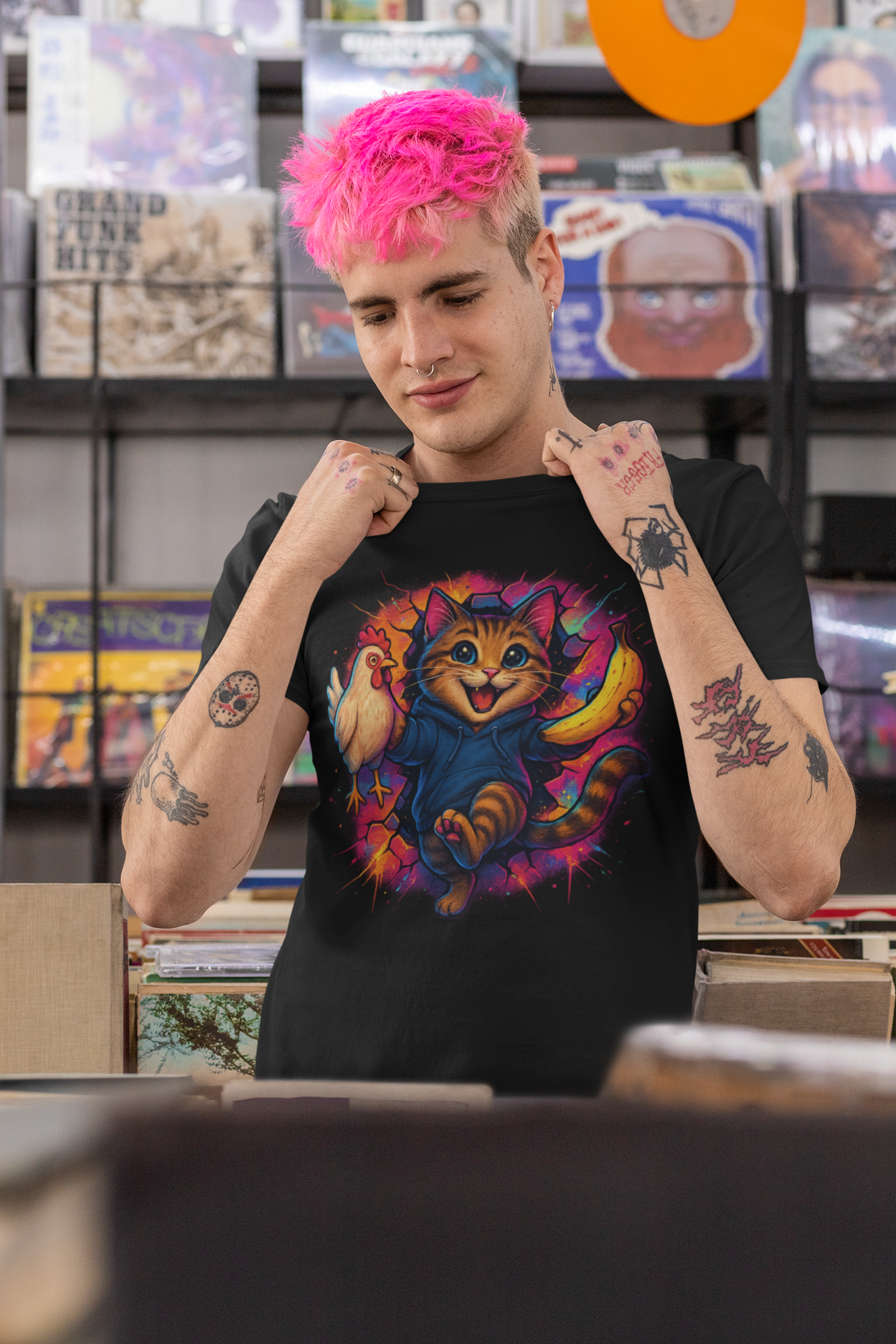 Add a shot of retro-cool and pure joy to your wardrobe with this exclusive Viral Tee Co. graphic tee. Featuring an adorable, neon-splattered cat bursting through holding a chicken in one paw and a banana in the other, it’s the perfect conversation-starter for your next live stream, coffee run, or weekend hangout.