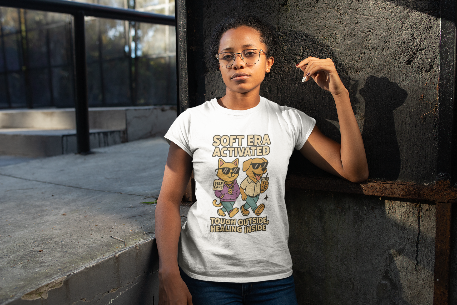 Step into your Soft Era with style and strength. This cozy tee features a cool cat and dog duo decked out in self-care vibes and subtle confidence. With the words “Soft Era Activated – Tough Outside, Healing Inside” front and center, it's more than a shirt—it's a mood.